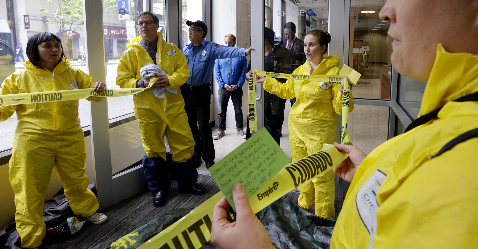 Top photo | Demonstrators inside a Chase bank branch wear hazmat suits as they block entry to the bank, May 8, 2017, in Seattle. Climate activists opposed to oil pipeline projects demonstrated at several JPMorgan Chase bank locations in Seattle, calling on the bank not to do business with TransCanada, the company pushing for the Keystone XL oil pipeline. (AP/Elaine Thompson)