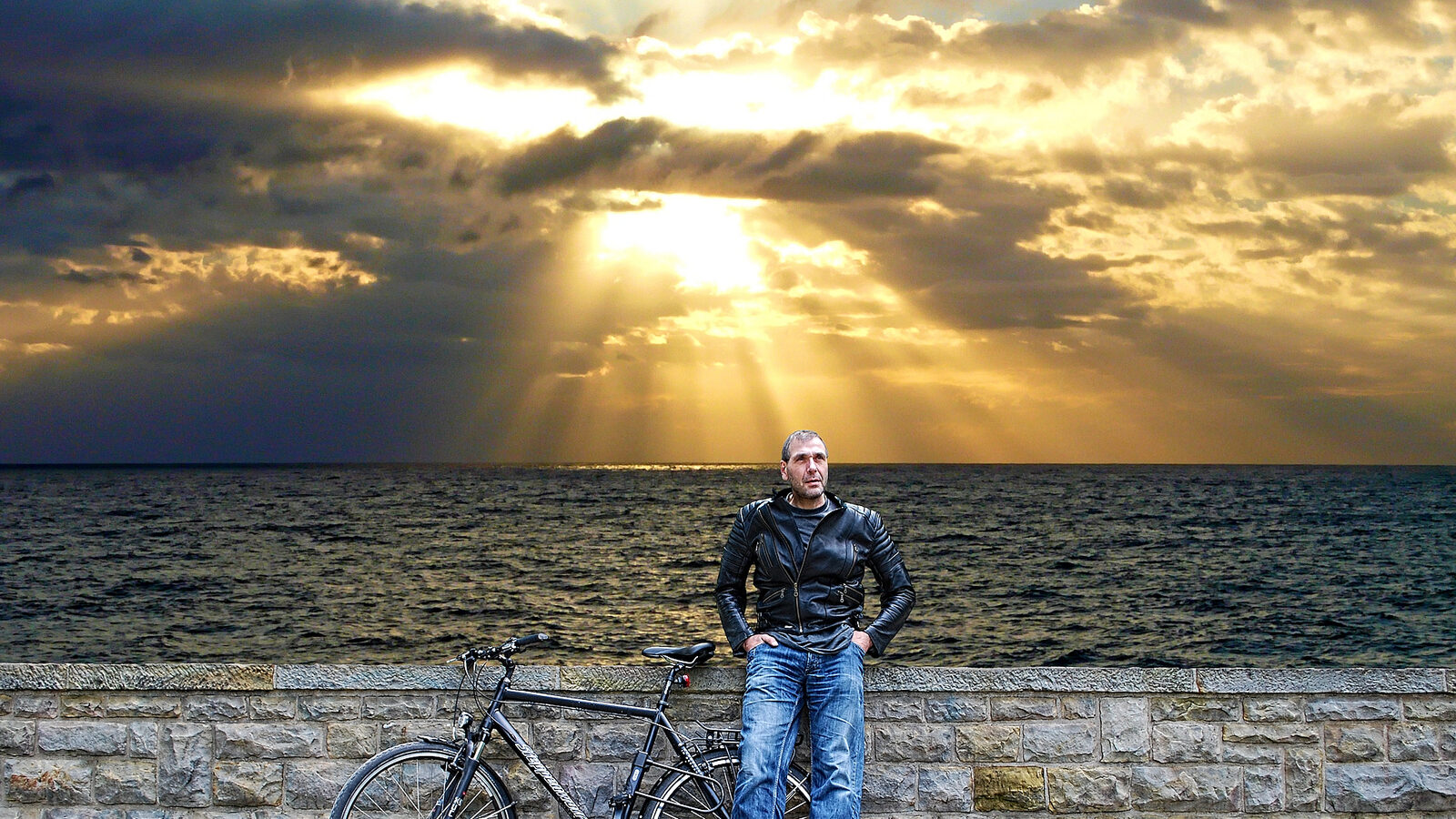 A man leans with his bicycle against a stone wall by the edge of the Atlantic Ocean at sunset. (Flickr / driver Photographer)