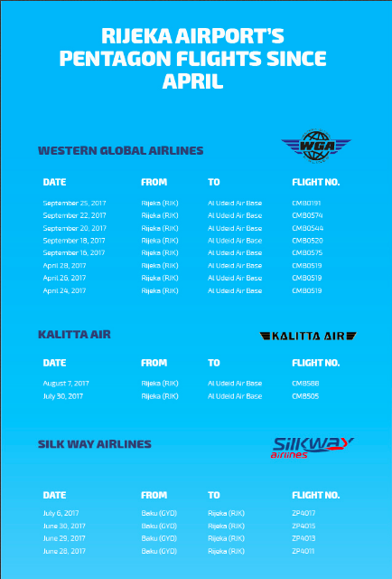 Each used a specific call-sign, ‘CMB’, given to cargo flights chartered by the Pentagon. Before landing in Rijeka, the planes used a commercial flight number, indicating that the military cargo was picked up in Croatia.
