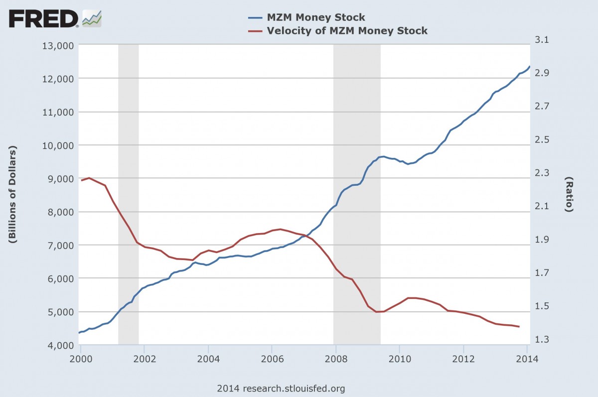 It is this low because the number of dollars in the world is only one part of the equation. The “velocity of money,” or the number of times money turns over in the economy, is equally important. Data since 2007 show what every freelancer and job seeker knows — it’s a tough world out there and people are pretty slow to let go of the cash they have.